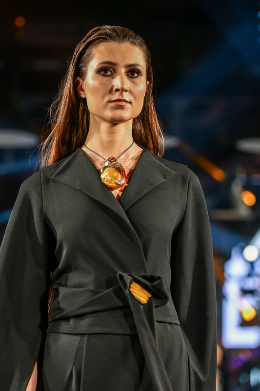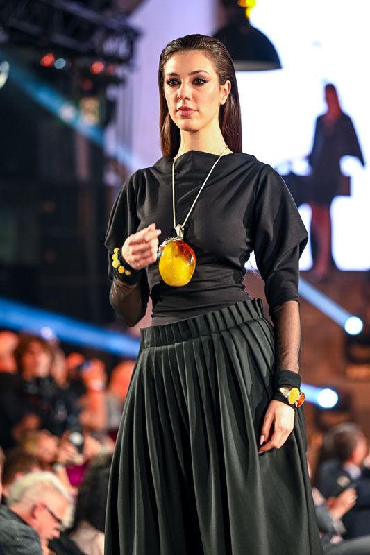 Gin Atelier to pracownia złotnicza, w której powstają małe formy rzeźbiarskie pełniące funkcję biżuterii. Podstawą kolekcji sygnowanych tą marką jest bursztyn bałtycki – zazwyczaj są to wyselekcjonowane, zachwycające barwą i rozmiarami naturalne bryły. Każda z nich zyskuje indywidualną oprawę dobraną w taki sposób, by najlepiej wyeksponować ich piękno. Również w kolekcji prezentowanej na wybiegu gali Amberif Vibes w Montowni bursztyn grał główną rolę, zyskując na efekcie wizualnym dzięki kontrastowemu zestawieniu z utrzymaną głównie w czarnym kolorze kolekcją strojów zaprojektowanych przez Joannę Weynę – stylowych, niekiedy wręcz minimalistycznych, wyróżniających się autorską interpretacją klasyki i wykreowanych w nurcie slow fashion.