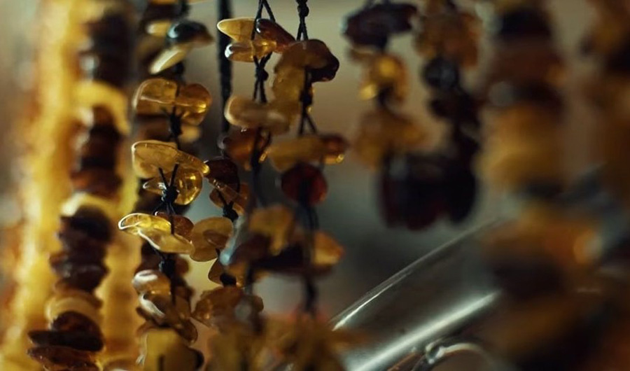 Ten region jest szczególnie związany z bursztynem – dzięki odkryciu większych i łatwo dostępnych nagromadzeń wtórnych bursztynu, które na wiele lat ukierunkowały zainteresowania i zajęcia tutejszych mieszkańców. Dostępność i łatwość pozyskiwania surowca zaowocowała trwałą obecnością bursztynu w kulturze kurpiowskiej – w stroju, lecznictwie, zabiegach magicznych i religijnych. Towarzyszył mieszkańcom regionu na każdym etapie ich życia: duże i okazałe bryły wręczane były córkom w dniu ich wesela, mniejszymi kawałkami płacono w sklepie lub na rynku, z drobnego wykonywano różne maści i nalewki. W wielu domach wisiały ozdobne kierce i pająki, gdzie obok słomek, piórek i szyszek wplecione były bursztynowe paciorki i różnej wielkości bryłki – pełniły one nie tylko funkcję dekoracyjną, ale miały za zadanie również odpędzić złe duchy i ochronić domostwo.