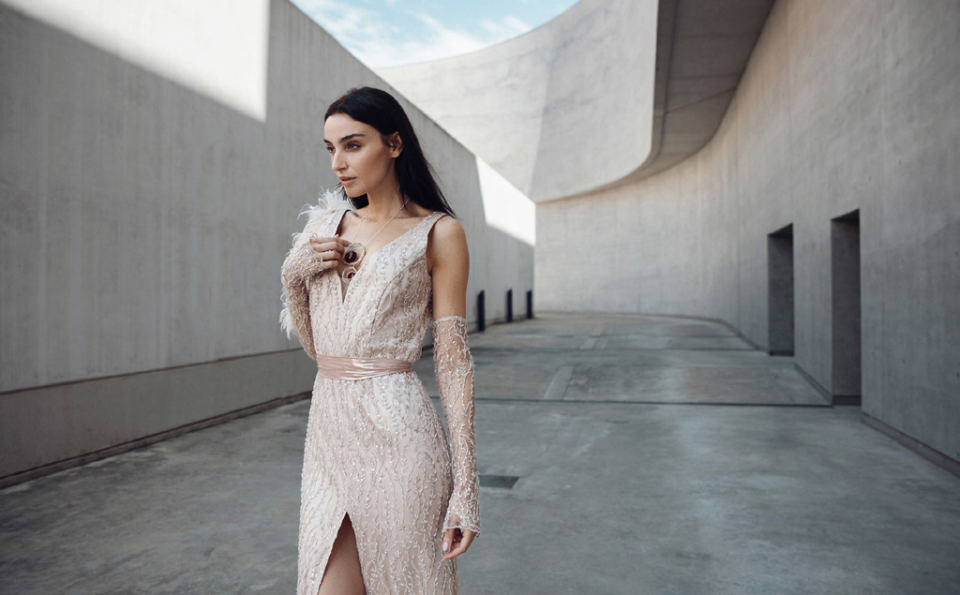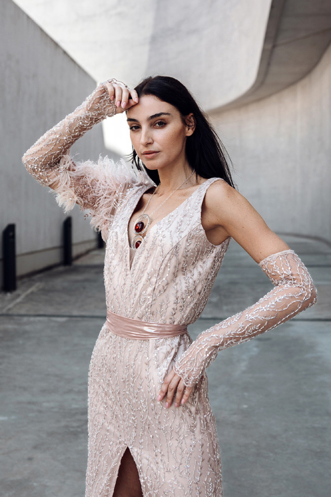 Nowoczesna biżuteria z bursztynem bałtyckim w barwach żółci i brązu stanowiła integralną część najnowszej kolekcji Barbary Piekut, w której dominowały koronki, jedwabie, pióra oraz ręcznie tworzone aplikacje. Jej ponadczasowy, elegancki styl wpisał się w filozofię projektantki stawiającej w modzie na ultra kobiecość i sensualność.