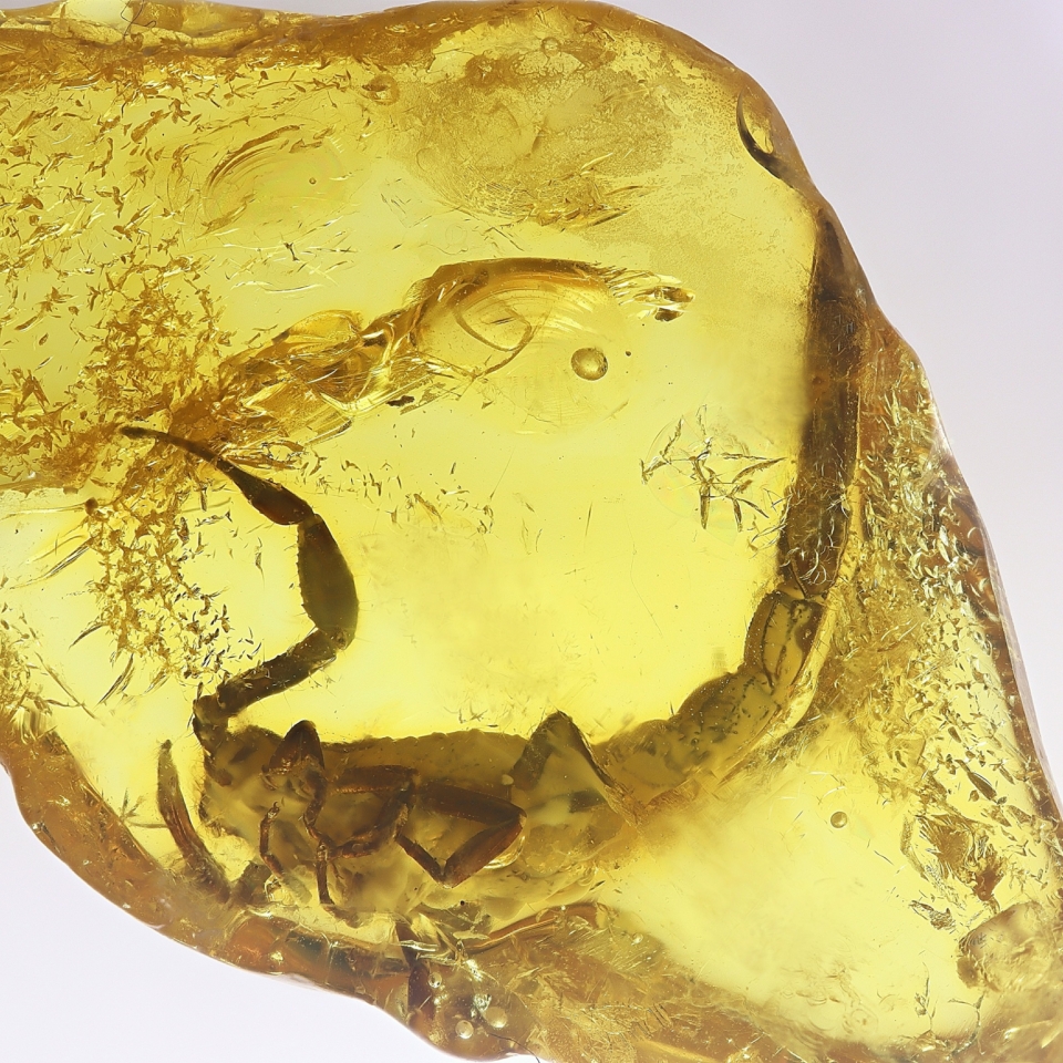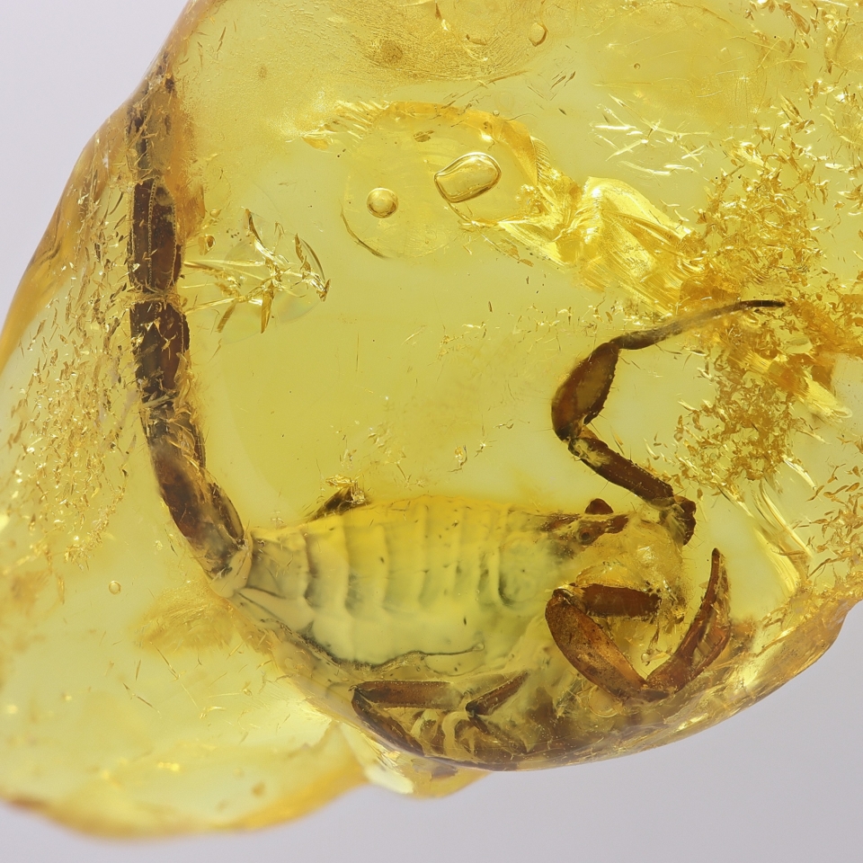 Sama bryłka mierzy 3 cm długości i 2 cm szerokości, zaś uwięziony w zastygłej żywicy skorpion ma około 2 cm długości. Inkluzja jest ładnie zachowana w przezroczystym bursztynie z lekką mleczną otoczką, charakterystyczną dla bursztynu bałtyckiego. Zakup z kolekcji znanego litewskiego kolekcjonera Jonasa Damzena był możliwy dzięki dofinansowaniu ze środków Ministerstwa Kultury i Dziedzictwa Narodowego. Narodowy Instytut Muzealnictwa i Ochrony Zbiorów w programie Rozbudowa Kolekcji Muzealnych przekazał na ten cel 80 proc. potrzebnych funduszy, czyli 197 186 PLN. Koszt zakupu inkluzji to 200 000 PLN.