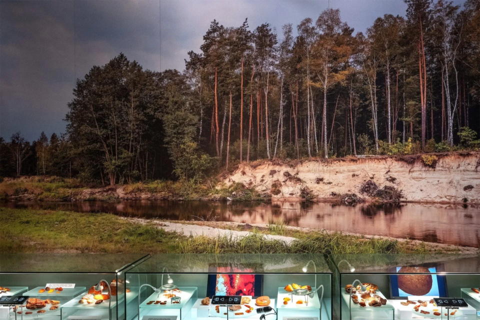 • formy naturalne i obrobione prezentujące odmiany bursztynu: pierwotne i wtórne,