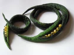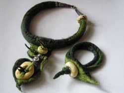 Paulina Binek: Kilka lat temu na targach Ambermart mieliśmy okazję oglądać wyroby z filcu wykonane przez artystkę, Polkę zamieszkałą w Niemczech, która wykonuje z niego różne obiekty, biżuterię i tkaniny. Maria Milewicz-Brauer prezentowała wtedy małą kolekcję, ale na tyle wielką, że zainspirowała wiele osób. Wiem to z rozmów z „poszukującymi” twórcami, którzy nie kryli swego zachwytu, ale nikt nie sięgnął dalej i nie wykorzystał tego w swoich pracach. Ze mną było inaczej: poznałam artystkę osobiście, kiedyś przywiozła mi trochę runa i pokazała, jak robić filc. Metodą prób i błędów doszłam do pewnych własnych rozwiązań.