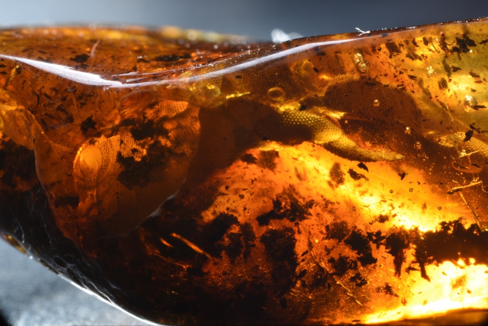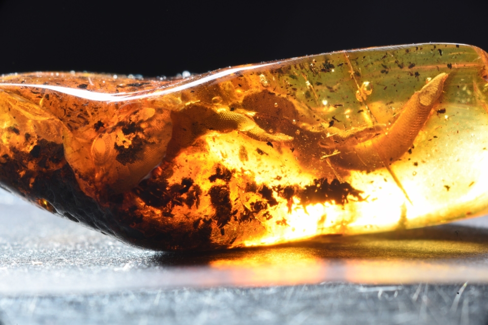 Inkluzja gekona - jedna z trzech nowych inkluzji w bursztynie bałtyckim, które już wkrótce będzie można oglądać w nowej siedzibie Muzeum Bursztynu w Gdańsku. Fot. Michał Szczerek, Muzeum Gdańska
