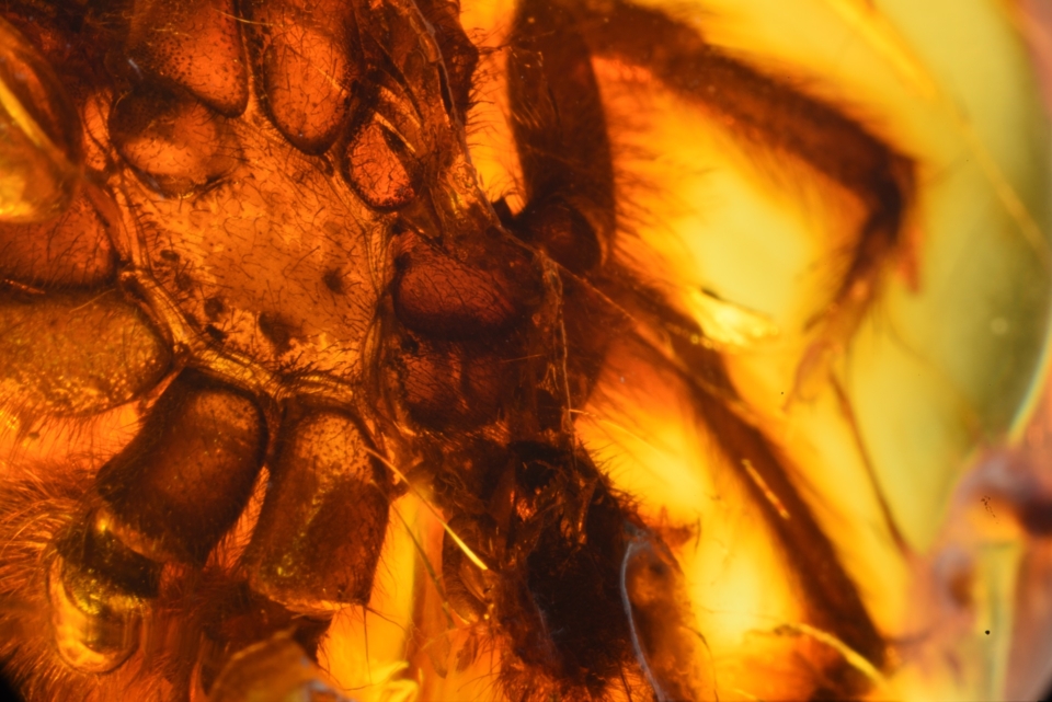 Pająk ptasznik w bursztynie bałtyckim mierzy ponad 4 centymetry i jest obecnie największą inkluzją tego typu na świecie.
